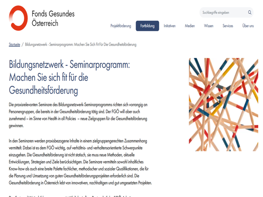 In den Seminaren des FGÖ (Fonds Gesundes Österreich) werden praxisbezogene Inhalte in einem zielgruppengerechten Zusammenhang vermittelt. Dabei ist es dem FGÖ wichtig, auf verhältnis- und verhaltensorientierte Schwerpunkte einzugehen. Die Gesundheitsförderung ist nicht statisch, sie muss neue Methoden, aktuelle Entwicklungen, Strategien und Ziele berücksichtigen. Die Seminare vermitteln sowohl inhaltliches Know-how als auch eine breite Palette fachlicher, methodischer und sozialer Qualifikationen, die für die Planung und Umsetzung von guten Gesundheitsförderungsprojekten erforderlich sind. Die Gesundheitsförderung in Österreich lebt von innovativen, nachhaltigen und gut umgesetzten Projekten. Termine und Seminarbuchung finden Sie hier.
